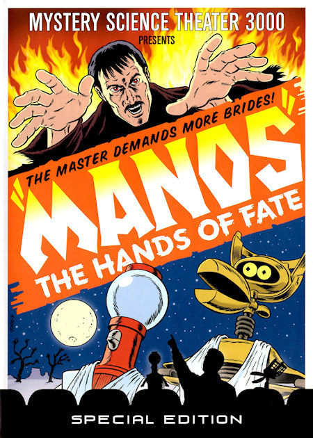 - Shout! Factory re-issued Manos as a 2-disc "Special Edition" on September 13, 2011. Disc 1 features the episode, The Mystery Science Theater Hour wraps, and a featurette, Group Therapy, in which Joel, Trace, Frank, and Mary Jo discuss the episode. Disc 2 features the original, unriffed movie; the documentary Hotel Torgo; the Ballyhoo Motion Pictures featurette Jam Handy to the Rescue, where Joel discusses the shorts used on MST3K; and Hired!: Parts 1 and 2, presented back-to-back for the first time.