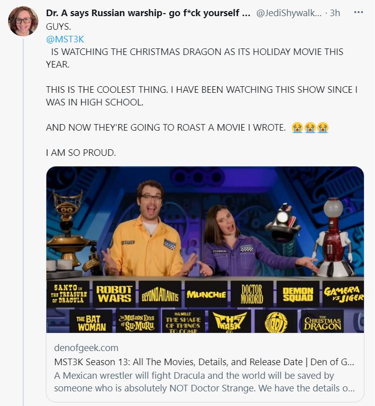 The Christmas Dragon is the third film made during the 2010s to be riffed on Mystery Science Theater 3000 following Atlantic Rim and Demon Squad.