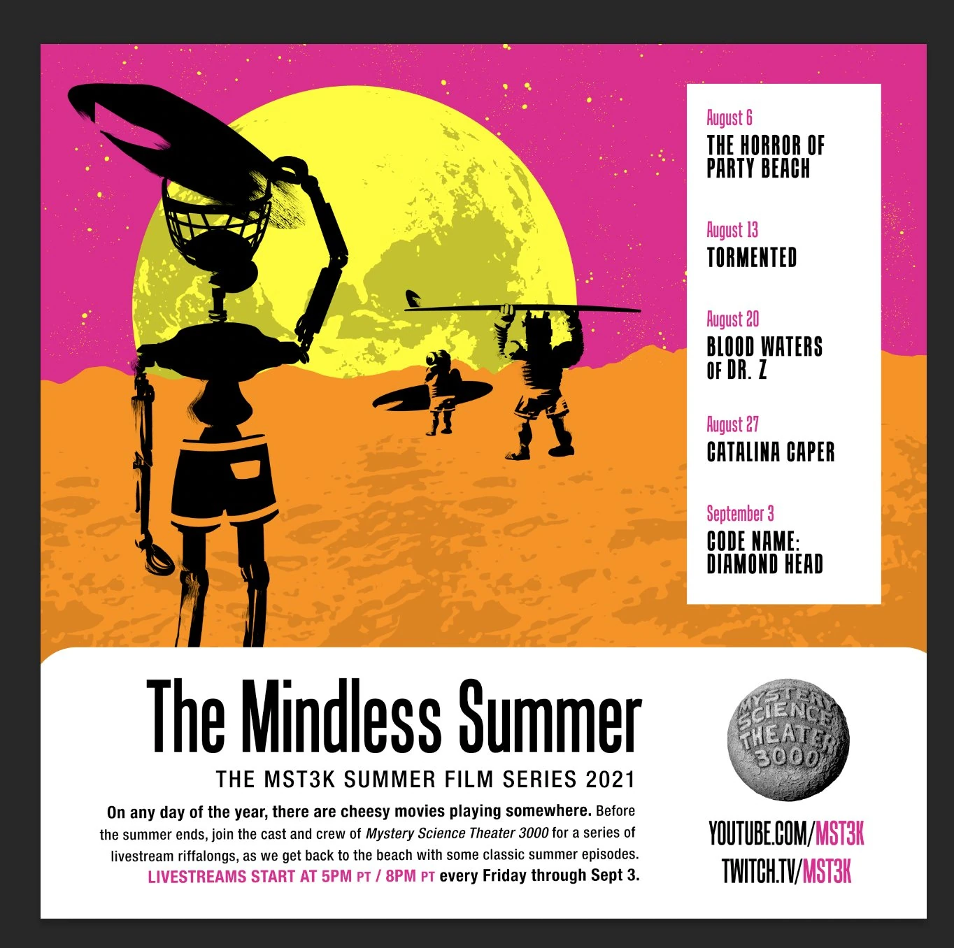 On five consecutive Fridays, episode of Mystery Science Theater 3000 were streamed on the show's YouTube channel, hosted by the current/upcoming casts and crew. These events are similar to the Live Riff-Along of 2020 and the events held during the Let's Make More MST3K crowdfunding campaign.